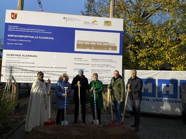 Mit einem feierlichen Spatenstich fiel in Kleinkahl der offizielle Startschuss für die Generalsanierung und Erweiterung der bestehenden Sporthalle. Rund 60 Gäste aus Politik, Verwaltung, Vereinsleben sowie von Planungs- und Bauseite folgten der Einladung von Bürgermeisterin Angelika Krebs. Gemeinsam beging man in der Feuerwehrhalle den Auftakt für die Erweiterung des Kleinkahler Freizeitlebens mit Musik, Speisen und Getränken. Gleichzeitig blickten die Anwesenden auf die Erinnerungen in der alten Turnhalle aus einem halben Jahrhundert zurück. Neben einer umfassenden energetischen Sanierung des Bestands entsteht ein Anbau mit Veranstaltungsraum, Küche und Sanitärbereich. Ein Fokus der Maßnahmen liegt auf Barrierefreiheit. Die erweiterte Mehrzweckhalle soll das kulturelle, sportliche und gesellschaftliche Herz der Gemeinde stärken. Sie steht nach Fertigstellung für die Nutzung durch örtliche Vereine, Schulen und Sportgruppen sowie für Gemeinderatssitzungen und Bürgerversammlungen zur Verfügung. Der Bund bezuschusst die Sanierung und Erweiterung mit gut 1,2 Millionen Euro aus dem Programm „Sanierung kommunaler Einrichtungen in den Bereichen Sport, Jugend und Kultur“.