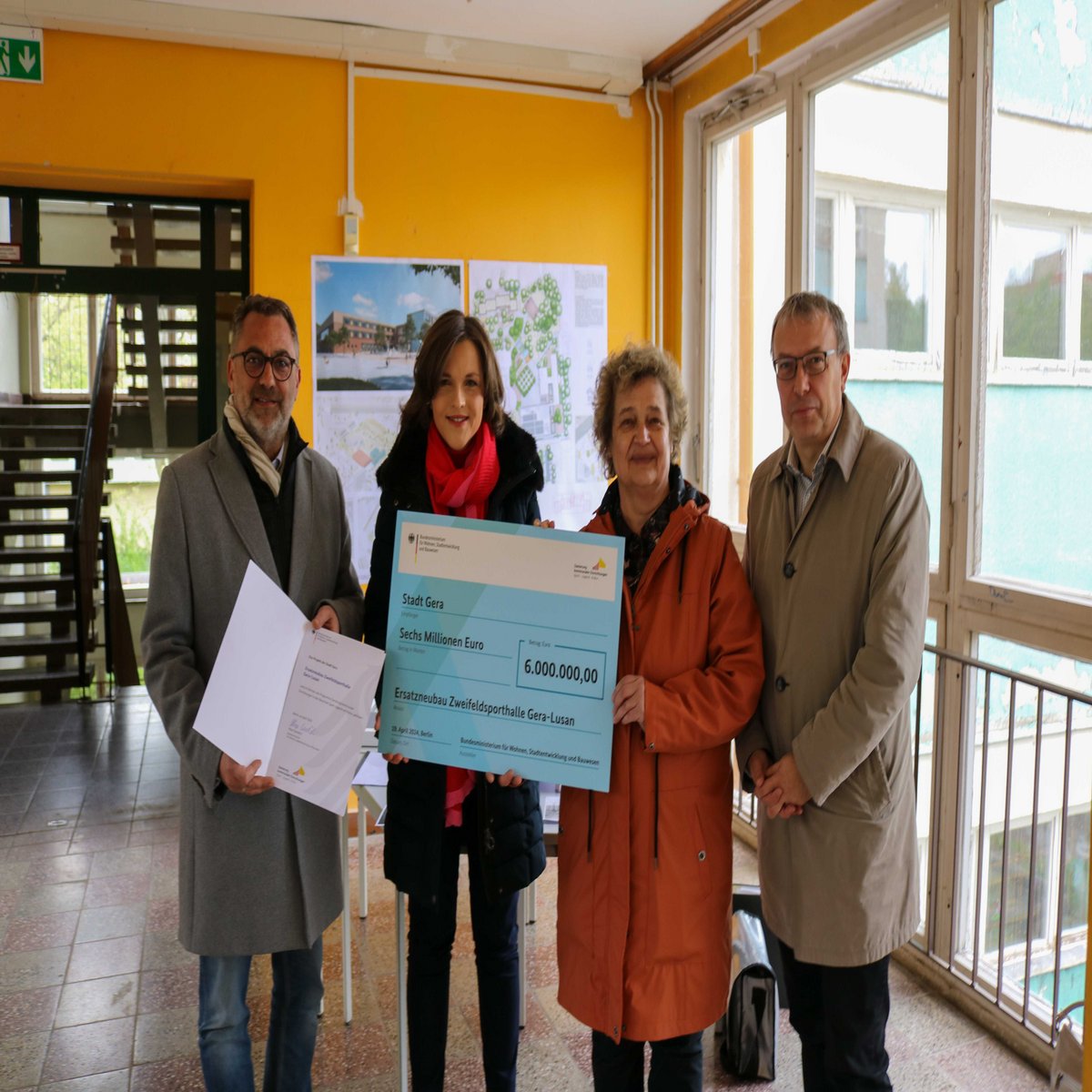 Bereits am 18. März 2024 hat die Stadt Gera einen Zuwendungsbescheid für den Ersatzneubau einer Zweifeldsporthalle inkl. Ergänzungsbauten im Stadtteil Lusan erhalten. Den symbolischen Förderscheck in Höhe von 6 Millionen Euro hat Staatssekretärin am 19. April 2024 bei einem Vorort-Termin ausgehändigt.