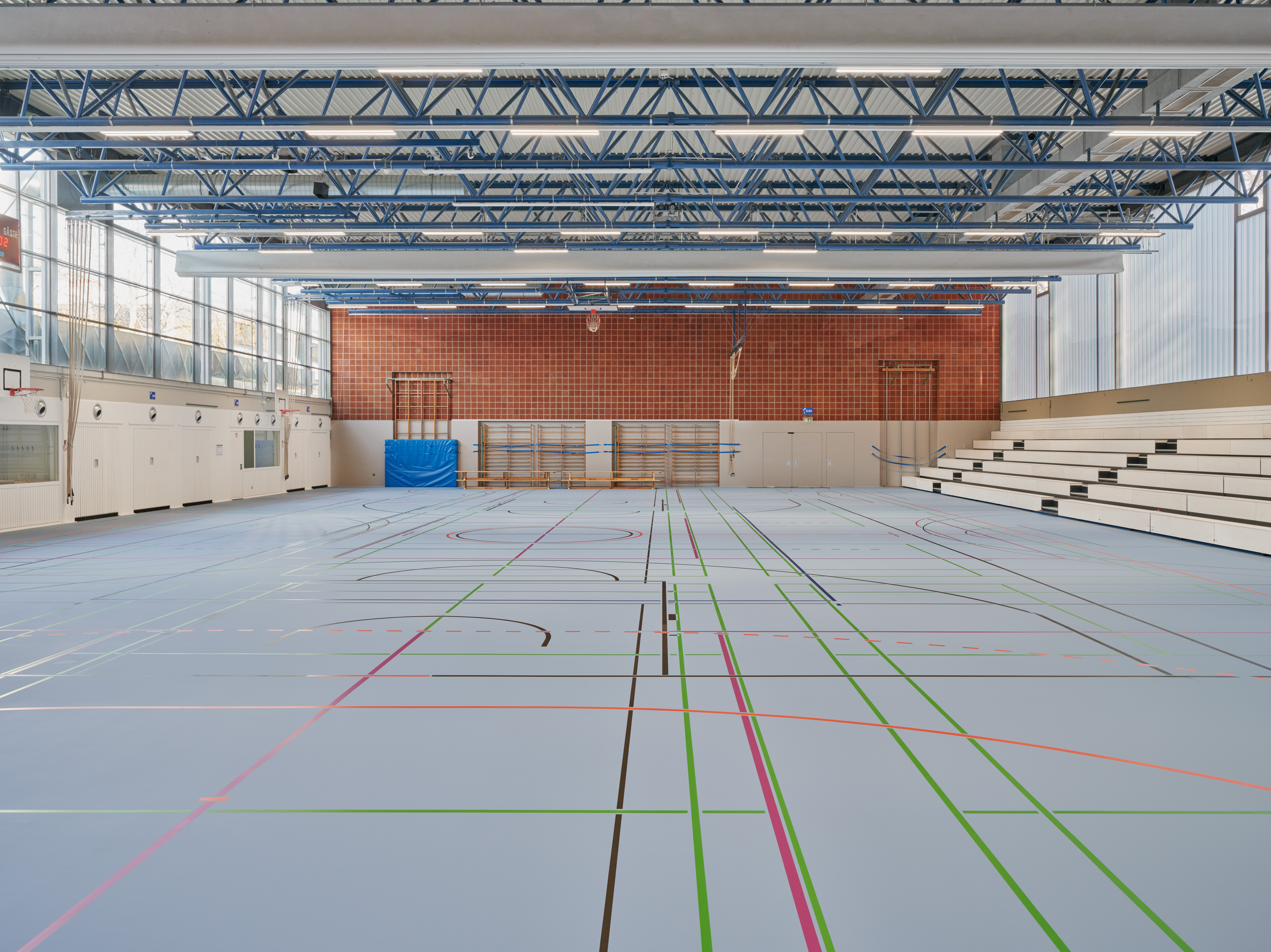 Die Sanierung umfasst die Neugestaltung der gesamten Außensportfläche, von einer Monostruktur hin zu einer multifunktionalen Begegnungsstätte. Es werden mehrere Kleinfelder für unterschiedliche Sportarten geschaffen, darunter Beachvolleyball, Basketball und Calisthenics. Die umliegenden Sitztribünen werden restrukturiert und an die neue Nutzung angepasst. In der Sporthalle werden der Hallenboden und die technische Gebäudeausstattung erneuert. Die Sanitär- und Umkleidebereiche werden barrierefrei erschlossen und ermöglichen zukünftig Menschen mit Behinderung die Teilhabe am Sport. Im Außenbereich finden an Fassade und Dach Dämmmaßnahmen statt, um die Energieeffizienz des Gebäudes zu erhöhen und so die Klimaschutzziele des Bundes zu unterstützen.